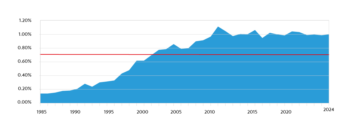 As the graph below shows, Luxembourg’s official development assistance initially grew slowly but steadily. At the Earth Summit in Rio de Janeiro in June 1992, Prime Minister Jacques Santer formally announced Luxembourg’s desire “to provide 0.7% of GNI by 2000”. This objective was then confirmed and in 1999 during the formation of the government, it was decided to set the rate of 0.7% as an objective to be reached by 2000, then to increase this aid “with a view to reaching 1% at the end of this government’s term”.