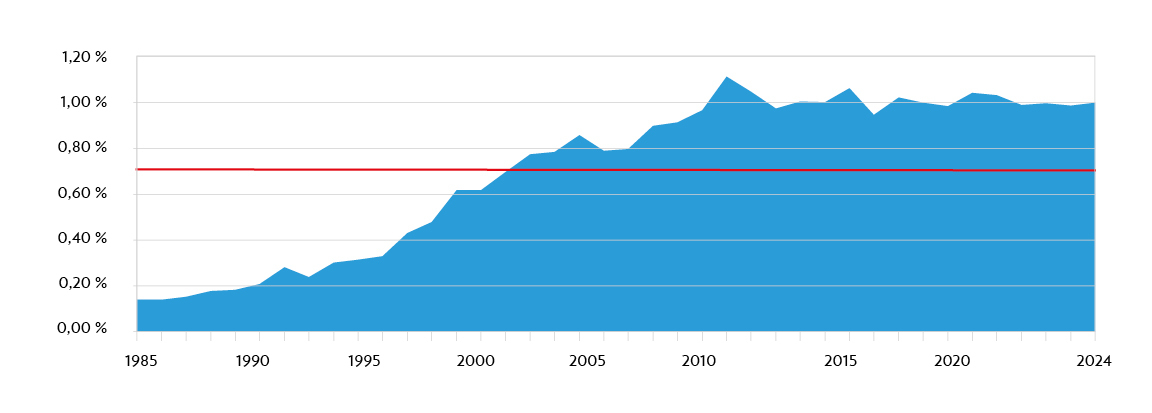 Comme le montre le graphique ci-dessous, l’aide publique au développement luxembourgeoise connut d’abord une croissance lente mais constante. A l’occasion du Sommet de la terre à Rio de Janeiro en juin 1992, le Premier ministre Jacques Santer annonçait solennellement la volonté du Luxembourg « d’arriver à 0,7 % du RNB à l’an 2000 ». Cet objectif fut confirmé par la suite et en 1999, lors de la formation du gouvernement, il fut décidé de se fixer comme objectif le taux de 0,7 % en 2000, puis d’augmenter cette aide « en vue de se rapprocher du 1 % en fin de législature ».