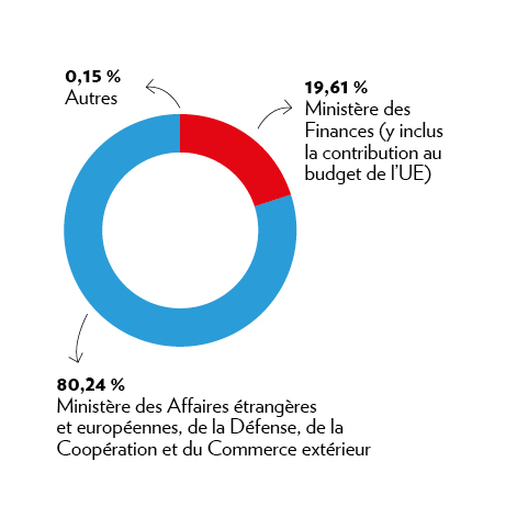 En 2024, le ministère des Affaires étrangères et européennes, de la Défense, de la Coopération et du Commerce extérieur (MAE) a géré 80,24 % de l’aide publique au développement, soit 442,69 millions d’euros (dont 431,11 millions d’euros pour la Direction de la coopération au développement et de l’action humanitaire). Les 19,76 % restants résultent de contributions effectuées par le ministère des Finances (9,59 %), par le ministère de la Santé et de la Sécurité sociale (0,05 %), par le ministère de la Digitalisation (0,04 %), par le ministère de la Culture (0,02 %), par le ministère de la Famille, des Solidarités, du Vivre ensemble et de l’accueil (0,02 %), par le ministère des Affaires intérieures (0,01 %) ainsi que par la contribution luxembourgeoise versée au budget général de l’UE qui a été affectée par la Commission européenne à des fins de coopération au développement en 2024 (55,29 millions d’euros, soit 10,02 % de l’APD luxembourgeoise). Le tableau récapitulatif suivant (APD par ministère) donne un aperçu détaillé des dépenses par article budgétaire et par ministère effectuées en 2024 et qui ont été notifiées comme APD au Comité d’aide au développement de l’OCDE.